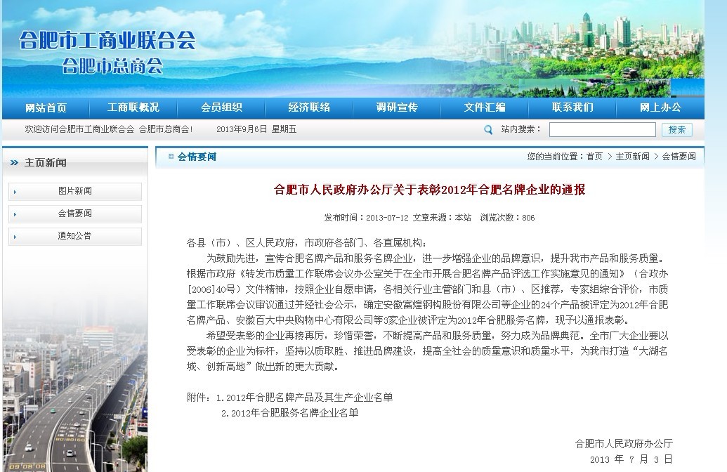 以下為《合肥市人民政府辦公廳關(guān)于表彰2012年合肥名牌企業(yè)的通報(bào)》(合政辦秘〔2013〕60號(hào))具體內(nèi)容(摘自工商聯(lián)合會(huì)網(wǎng)站)