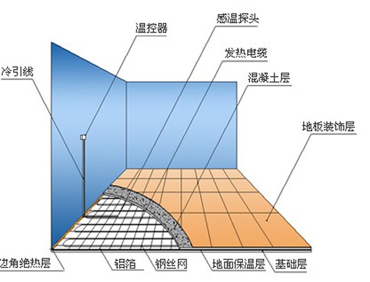 發(fā)熱電纜采暖系統(tǒng)由發(fā)熱電纜和溫控器兩部分組成,發(fā)熱電纜鋪設(shè)于地面中,溫控器安裝于墻面上。當(dāng)室內(nèi)環(huán)境溫度或地面溫度低于溫控器設(shè)定的溫度時(shí),溫控器接通電源,發(fā)熱電纜通電后開(kāi)始發(fā)熱升溫,發(fā)出的熱量被覆蓋著的水泥層吸收,然后均勻地加熱室內(nèi)空氣,還有一部分熱量以遠(yuǎn)紅外輻射的方式直接釋放到室內(nèi)。該種方式的采暖系統(tǒng)把整個(gè)地面作為散熱器,室內(nèi)溫度上層低而下層高,有溫足而頂涼的感受,使您感到舒適而自然。